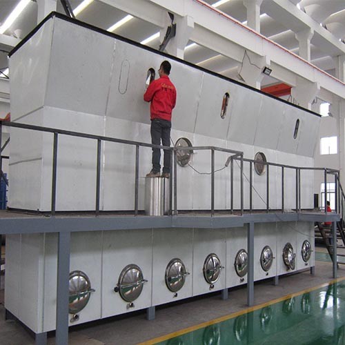 潔凈的熱風(fēng)經(jīng)閥板分配進(jìn)入床體內(nèi),從加料器進(jìn)入的濕物料被熱風(fēng)形成流化狀態(tài),如煮沸的開水在床體內(nèi)跳躍,故稱為沸騰干燥器(沸騰干燥機(jī)),由于熱風(fēng)與物料廣泛接觸,因此在較短的時(shí)間內(nèi)就可以干燥。從床體的一頭進(jìn)入,經(jīng)幾分鐘至幾十分鐘時(shí)間的“沸騰”,從床體的另一頭自動(dòng)流出。