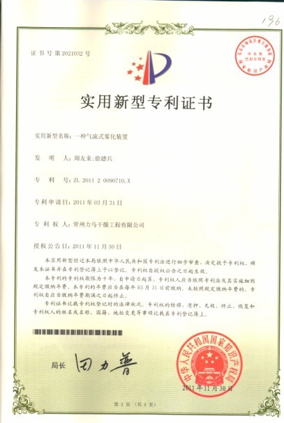 一種氣流式霧化裝置專利證書