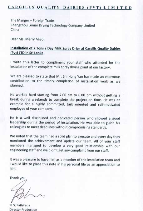 信中這樣寫道:“親愛(ài)的Merry Miao女士:我寫這封信主要是想要贊美一下你公司的這次參加了我們廠完整的牛奶噴霧干燥設(shè)備安裝的員工。我們真的很高興,特別是史洪雁先生,他在這次安裝任務(wù)中作出了巨大的貢獻(xiàn),他按照我們的計(jì)劃時(shí)間表提前完成了安裝工作。他工作很努力,每天從早晨7點(diǎn)到下午6點(diǎn),周末都沒(méi)有休息,只為了能夠按時(shí)保質(zhì)保量完成項(xiàng)目。他代表著一個(gè)致力于任務(wù)導(dǎo)向和自我激勵(lì)的公司。并且他是一個(gè)很有紀(jì)律的人,在領(lǐng)導(dǎo)小分隊(duì)安裝期間,嚴(yán)格要求自己,一直堅(jiān)持到最后完成安裝。我們還注意到,你們的團(tuán)隊(duì)計(jì)劃非常明確,每天都在監(jiān)控設(shè)備的使用情況,并對(duì)我們的人員進(jìn)行現(xiàn)場(chǎng)培訓(xùn)。你們所有的員工與我們的工程人員都相處得非常愉快,我們沒(méi)有得到任何來(lái)自我們員工的投訴。最后,我想說(shuō)的是,我把史洪雁先生寫在信中,只是因?yàn)閱渭兊男蕾p這個(gè)人。”